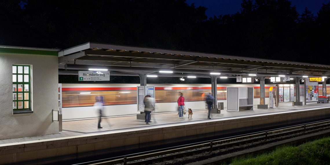 In der U1-Haltestelle Meiendorfer Weg in Hamburg sorgt die intelligente Steuerungstechnik für eine durchgängige Beleuchtung. Das Pilotprojekt wurde im Rahmen des barrierefreien Ausbaus der Station initiiert. Es zeigt eindrucksvoll die Möglichkeiten und Vorteile auf, die der Einsatz einer bedarfsgerechten Beleuchtungssteuerung für Betreiber und Fahrgäste eröffnet.