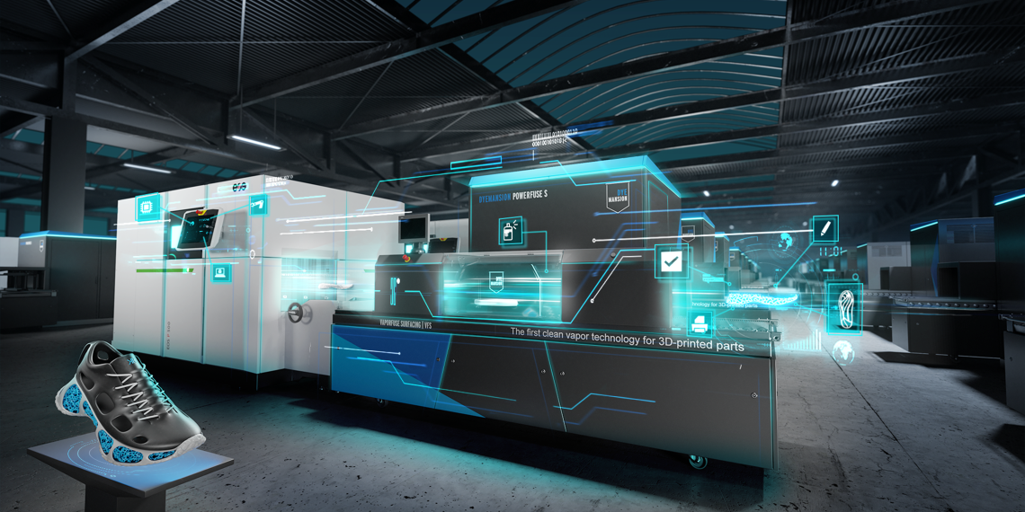 Im Bereich der Nach­be­ar­bei­tung ermög­licht der auf­ein­an­der abge­stimm­te drei­stu­fi­ge Print-to-Pro­duct Work­flow von Dye­M­an­si­on die Ska­lie­rung vom Pro­to­typ­ing oder Klein­se­ri­en­bau hin zur addi­ti­ven Seri­en­fer­ti­gung. Die inte­grier­te Sie­mens-Auto­ma­ti­sie­rung lässt sich in die indus­tri­el­le Shop-Floor-IT ein­bin­den und bie­tet eine Opti­mie­rung der Main­ten­an­ce und Bedienerführung
