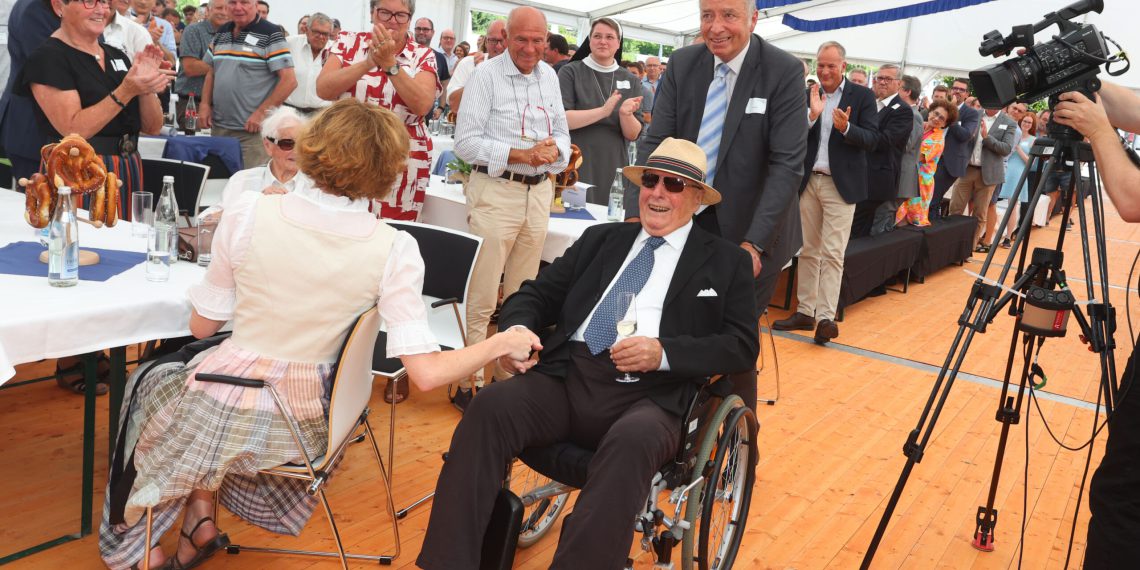 Einen Einblick in die Familie hinter dem großen Unternehmen gab Korbinian Mayr-Kennerknecht, freier Autor, Schriftsteller und Bruder von Ferdinand Mayr, der die von ihm verfasste Firmenchronik „Hidden Champion – Von der Mühlschreinerei zum Weltmarktführer“ vorstellte. Er verwies auf das „Mindset“ des Firmengründers Christian Mayr, seines Ur-Ur-Großvaters, sowie seines Großvaters Fritz Mayr: Die richtigen Fragen stellen, Dinge zu lassen, manchmal auch „Nein“ sagen und Gestaltungsräume lassen. Unterstützt wurde er bei der Recherche für das Buch auch von ehemaligen Mayr-Mitarbeitenden wie der Ruheständlerin Monika Haug mit 48 Jahren Betriebszugehörigkeit, die einen Einblick in ihre Berufsanfänge in den 1950er Jahren gab: „Wenn ich einen Fehler gemacht habe, musste ich Samstagvormittag arbeiten“, erzählte sie schmunzelnd. „Aber ich muss sagen, es war immer schön hier zu arbeiten.“ CFO Christian Illig betonte: „Die Mitarbeiter sind unser wertvollstes Gut und der wohl wichtigste Erfolgsfaktor im Unternehmen. Wir geben Freiraum, sich mit dem Unternehmen zu entwickeln.“ Korbinian Mayr-Kennerknecht machte deutlich, dass sein Großvater Fritz Mayr schließlich den Wandel vom Handwerksbetrieb hin zum Industriebetrieb eingeleitet und der Firma so zu ihrem heutigen Stellenwert verholfen habe: ein international agierendes Unternehmen mit insgesamt über 1350 Mitarbeitenden und Weltmarktführer in seinem Produktbereich. Emotional daher auch der Moment, als Seniorchef Fritz Mayr (96) trotz des Trubels und der Hitze überraschend und unangekündigt im Festzelt erschien und von Belegschaft und Gästen begeistert und mit Standing Ovations empfangen wurde. Eine große, ehrliche Würdigung für den Mann, der den Grundstein des heutigen Erfolgs gelegt hat.