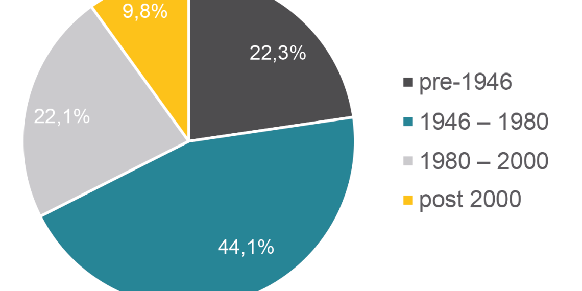 Der Markt ist sich größtenteils einig, dass der notwendige Ausbau hauptsächlich mit Glasfasertechnik zu bewältigen ist, um sowohl Festnetz- als auch Wireless-Versorgung über 5G zu gewährleisten. Dies betrifft nicht nur die Netzebene 3, sondern insbesondere die Weiterleitung der Signale und Dienste bis zum Endteilnehmer. Eine Darstellung des Wohngebäudebestands in der Europäischen Union lässt hierzu Rückschlüsse auf die ITK-Infrastruktur zu (Abb. 1): Da über 88 % der Wohnhäuser vor dem Jahr 2000 errichtet wurden, ist davon auszugehen, dass dort größtenteils eine Twisted-Pair- oder Koaxialverkabelung vorhanden ist, so dass hier ein enormes Modernisierungspotenzial vorliegt. Entsprechende Modernisierungsanstrengungen werden momentan aufgrund der Corona-bedingt gestiegenen Aufmerksamkeit von Netzbetreibern und Politik stark vorangetrieben.