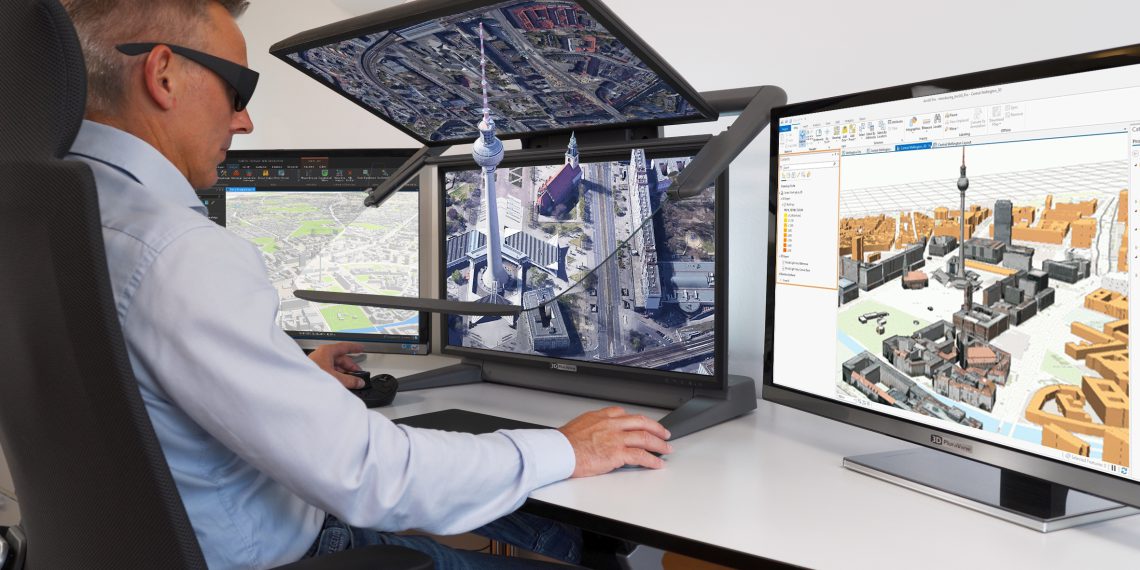 Hier setzt der US-amerikanische Softwareanbieter Esri auf die leistungsstarke Performance der passiven 3D-Stereo Beamsplitter Monitore „3D PluraView“ von Schneider Digital. Diese Doppelbildschirmsysteme sind defacto seit 16 Jahren der Industriestandard für alle stereoskopischen Software-Anwendungen und sind für alle gängigen 3D-stereofähigen Photogrammetrie und GIS Applikationen zertifiziert. Der hochklappbare Beamsplitter-Spiegel erlaubt es die 3D PluraView Monitore auch flexibel als Standardmonitor für monoskopische Aufgaben zu nutzen. Mit Bildschirmdiagonalen bis zu 28“ liefern die völlig flimmerfreien 3D PluraView-Monitore hochdetaillierte, stereoskopische 3D-Visualisierungen. Dank eines Bildschirms pro Stereokanal bieten sie dabei die volle Stereo-Auflösung von bis zu 4K (UHD) mit 10-Bit Farbtiefe in brillanter Helligkeit. Mit passiver Polfilter-Technologie ermöglichen sie selbst bei Tageslicht im Büro ein ermüdungsfreies, ergonomisches Arbeiten selbst mit mehreren Betrachtern gleichzeitig.
