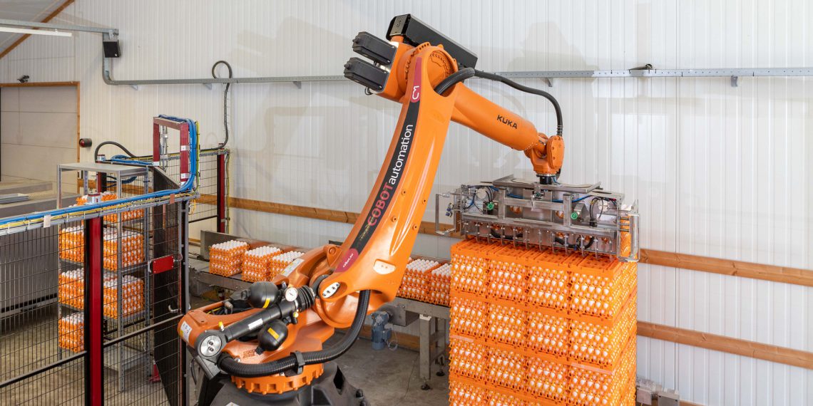 Das Unternehmen, das seit der Gründung 1997 unter dem Namen „Cobot Automation“ firmierte, entwickelte seine erste Automatisierungslösung zum Handling roher Eier. Mit Erfolg. Cobot Automation war als Maschinenbaubetrieb gegründet worden und hatte von Anfang an viele Landwirte beliefert. Nun spezialisierte sich das Team zunehmend auf Geflügelhöfe. Damit gewannen die Niederländer begeisterte Kunden in ganz Europa, der Türkei und den USA – und banden immer häufiger Kuka Roboter in die Automatisierungslösungen ein. Seit Mai 2021 trägt das Unternehmen einen Namen, der zur Spezialisierung passt: Meggson, schließlich stehen hier Eier (englisch eggs) im Mittelpunkt.