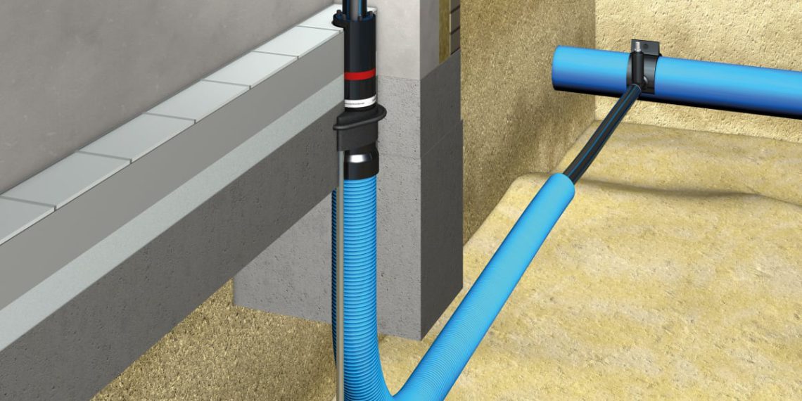 Dieses Produkt wurde speziell für Gewerbebauten und Mehrfamilienhäuser entwickelt und kommt immer dort zum Einsatz, wo größer dimensionierte Versorgungsleitungen (zum Beispiel Strom oder Wasser) in das Gebäude eingeführt werden sollen. Solche Leitungen passen hдufig nicht in die standardisierten Einsparten — und Mehrsparten-Hauseinführungen, die zum Beispiel in Einfamilienhдusern verbaut werden. Zu diesem Zweck ist das Produkt mit einem 10 Meter langen biegesteifen Mantelrohr mit einem Innendurchmesser von 110 mm ausgestattet, das die erforderlichen Biegeradien sicherstellt. Die Leitungen lassen sich unabhдngig von Baufortschritt einfьhren und kцnnen bei Bedarf ausgewechselt werden (Relining).