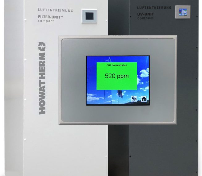 Zur komfortablen Bedienung der UV-Unit verfügt das Gerät von Howatherm Klimatechnik über ein Touchdisplay. Durch die enge Verzahnung beider Geräte können Daten und Variablen direkt in eine Visualisierungs-Software übernommen werden. Die UV-Unit compact stellt zum Beispiel die Messwerte des geräteinternen CO2-Sensors in Form einer CO2-Ampel dar – spätestens, wenn die Ampel auf Rot springt, ist die CO2-Konzentration im Raum zu hoch und es sollte gelüftet werden.