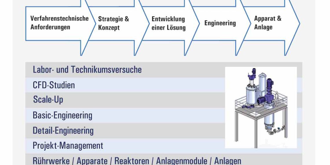 Eingespielte, interdisziplinäre Projektteams, modernste Versuchseinrichtungen und ein branchenweit anerkanntes CFD-Kompetenzzentrum garantieren eine schnelle und sichere Konzeptfindung für komplexe rührtechnische Aufgabenstellungen. In dem neuen Forschungszentrum ist auf 1.000 m² Technikums- und Laborfläche fast jede rührtechnische Untersuchung zwischen einem Liter und 100 m³ möglich. CFD-Untersuchungen ergänzen die Versuchstechnik, um mögliche Lösungsvarianten und das Strömungsverhalten schneller analysieren und verifizieren zu können. Die so ermittelten Konzepte für gerührte Prozesse werden dann im Rahmen einer umfassenden Apparate- und Anlagenplanung in technisch und betriebswirtschaftlich sichere Lösungen umgesetzt.