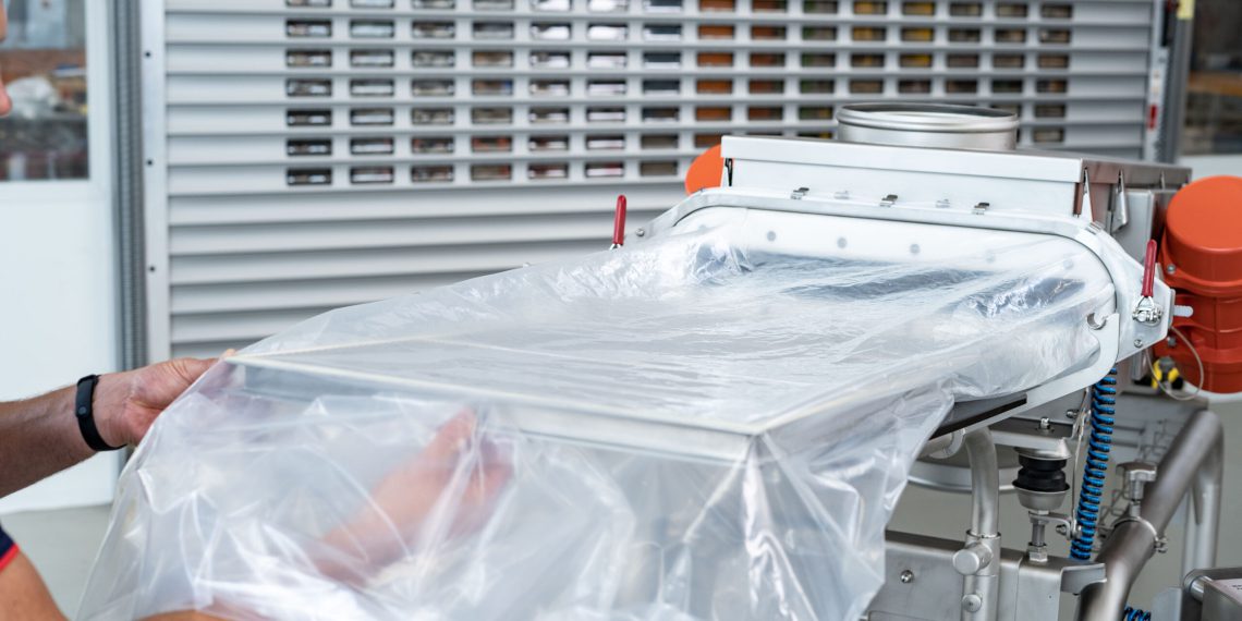 Das Containment-Sieb basiert auf einem Single-Use-Konzept, das mit Spezialfolie arbeitet: der Bediener dockt einfach einen vorbereiteten Foliensack an die Maschine an, mit dessen Hilfe kontaminierte Siebeinleger sicher aus‑, und neue Siebeinleger eingeschleust werden können.