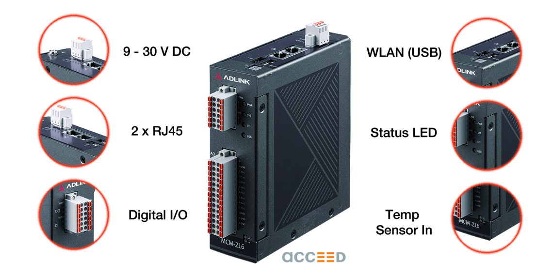 Angetrieben werden sowohl der MCM-216 als auch der MCM-218 von einem ARM Cortex-A9 mit 1,0 GHz. Abhängig vom Modell stehen 8 oder 16 Kanäle mit je 250 kS/s Samplingrate für die simultane Aufnahme von Sensorsignalen bereit. Beim MCM-216 ist der Bereich der erfassten Eingangsspannung wählbar. Neben der Netzanbindung über zwei GbE-Schnittstellen sind auch optionale WLAN-Module in den USB-Buchsen möglich. Das Aluminiumgehäuse ist mit seinen kompakten Abmessungen von 127 x 111 x 40 Millimetern auch für die Hutschienenmontage geeignet. Die zulässige Umgebungstemperatur für den Betrieb ist mit 0 bis 50 °C angegeben. Weitere technische Details und Informationen zu Anwendungsmöglichkeiten sind direkt beim deutschen Distributor Acceed erhältlich.