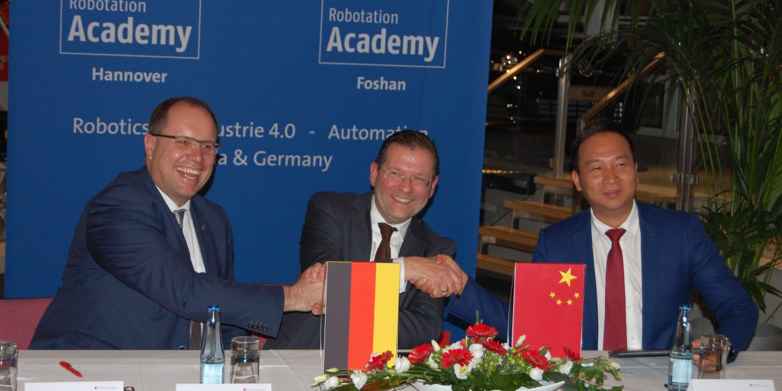 Ein Projekt aus Hannover zieht es in die Welt. Im November 2017 wird im chinesischen Foshan eine Robotation Academy eröffnen – entwickelt und aufgebaut von Fachleuten aus Hannover. Den Grundstein dafür haben die Geschäftsführer der Deutsche Messe Technology Academy, Thomas Rilke und Olaf Katzer, am Mittwochabend (7. Dezember) in Hannover bei einer Vertragsunterzeichnung mit Repräsentanten der Stadt Foshan gelegt. In der Robotation Academy in Foshan werden künftig jedes Jahr rund 1 000 Industrievertreter in den Disziplinen Robotik und Automation sowie im breiten Themenfeld rund um Industrie 4.0 geschult und weitergebildet.