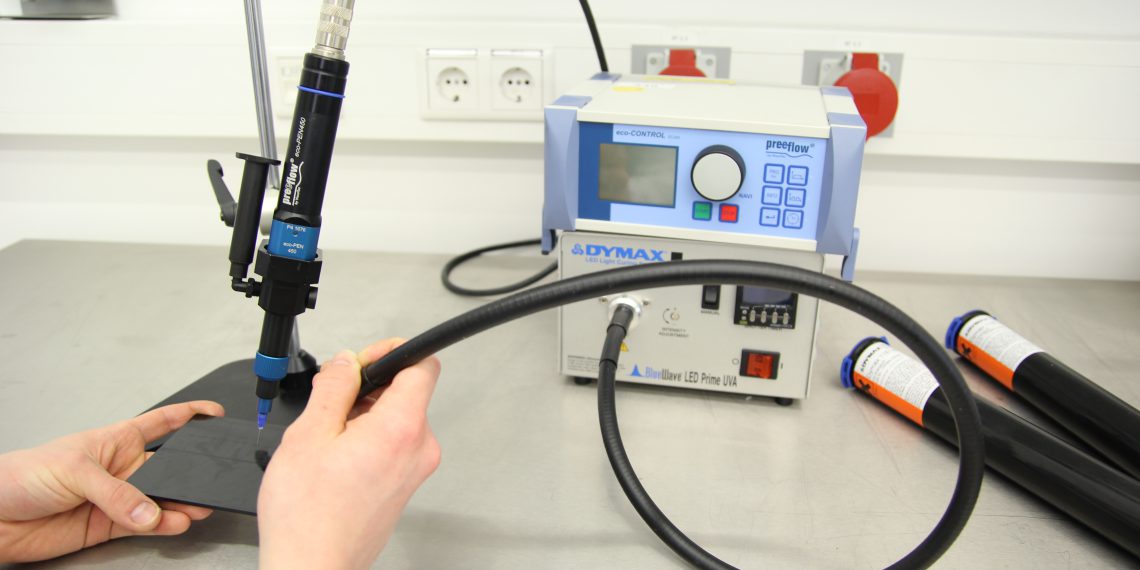 Für Dosierversuche mit verschiedenen Materialien nutzte DYMAX Europe GmbH einen preeflow eco-PEN Dispenser. Die lichthärtenden Klebstoffe können im Bereich Mikrodosierung oft nicht mit herkömmlichen Dosiersystemen aufgetragen werden. Besonders konstante, präzise Formen kleiner und kleinster Dosierraupen oder füllstoffhaltige Klebstoffe können teilweise nur mit den preeflow Dosiersystemen perfekt umgesetzt werden.