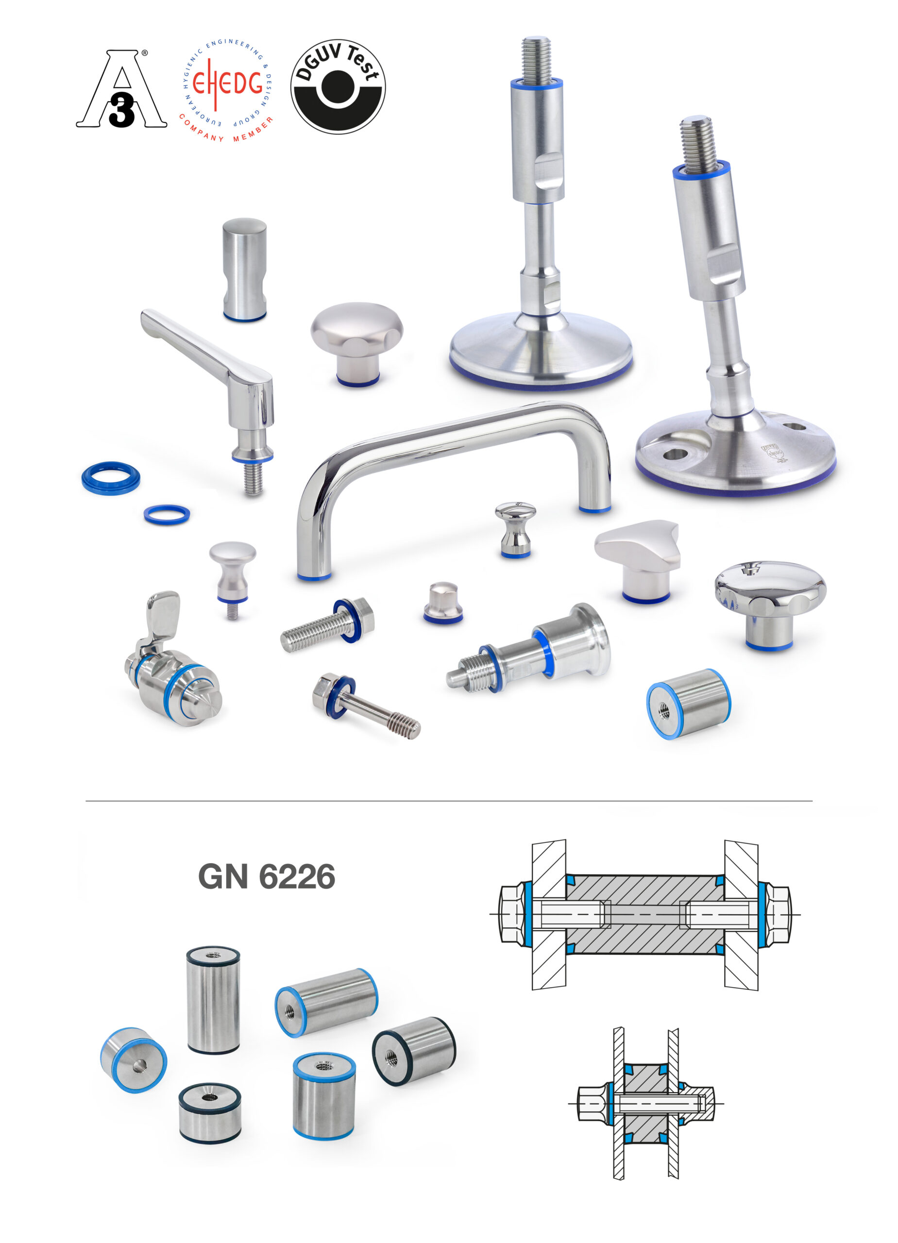 Auf den ersten Blick scheinen die meisten Normelemente zwar weit weg von den eigentlichen kritischen Arbeitsbereichen zu sein, doch luftgängige Sporen von Mikroorganismen sind in der Lage, sich schnell und weit auszubreiten. Da bereits kleinste Schwachstellen zur Kontamination kompletter Produktionslinien führen können, hat Ganter eine ganze Produktfamilie an speziellen Normelemente entwickelt. Sie verbinden minimale Verschmutzungsneigung mit optimaler Reinigungsfähigkeit und entsprechen damit den sehr hohen Anforderungen des 3‑A-Sanitary-Standards, der EHEDG sowie der DGUV-Test.