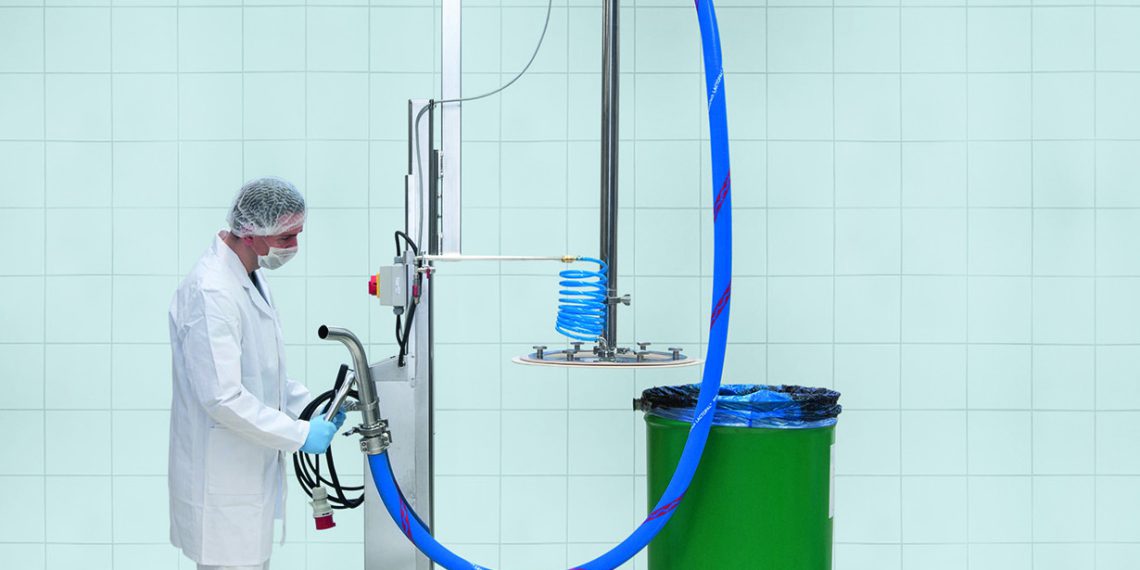 Alle medienberührten Komponenten von Viscoflux mobile S sind konform gemäß den Verordnungen EG 1935/2004 sowie FDA CFR 21. Das Prozessgerät aus rostfreiem Edelstahl kann auch permanent in feuchten Produktionsumgebungen verbleiben. Akku und Elektronik sind dazu gegen Feuchtigkeit gekapselt im Mast integriert, ebenso wie der neue, automatische Freilauf, der die Bedienbarkeit des Geräts noch leichter macht. Für eine gute Reinigbarkeit wurden wichtige Details des Systems so konstruiert, dass keine Hohlräume entstehen, in die Medium eindringen könnte. So wurde das Fahrwerk zum Beispiel als einteilige Schweißkonstruktion gefertigt. Mit Schutzart IP 66 kann das Prozessgerät problemlos mit Strahlwasser gereinigt werden.
