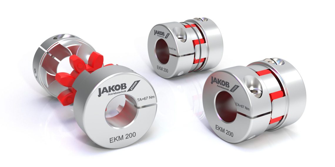 Elastomerkupplungen sind steckbare, spielfreie und flexible Wellenkupplungen. Das Verbindungs- beziehungsweise Ausgleichselement besteht aus einem Kunststoffstern mit evolventenförmigen Zähnen und einer hohen Shorehärte. Dieser elastische Kupplungsstern wirkt elektrisch isolierend und weist ein gutes schwingungsdämpfendes Verhalten auf. Er wird formschlüssig und mit leichter Vorspannung in zwei hochpräzise gefertigte Naben mit klauenförmigen Nocken eingesetzt. Die Firma Jakob Antriebstechnik mit Sitz in Kleinwallstadt hat diverse Elastomerkupplungsvarianten im Sortiment, die per Baukastensystem nach Wunsch zusammengestellt werden können. Die Kupplung EKM kommt mit beidseitig radialer Klemmnabe als kostengünstige, kompakte Standardbaureihe. Sie deckt Drehmomentbereiche von 8 – 2000 Newton Meter und Wellendurchmesser von 8 – 90 Millimeter ab. Sonderanfertigungen sind ebenfalls möglich. So ist sie auch mit Axialanschlag oder als Kombination mit der Reihe ESM‑A mit Konus-Spannringnabe erhältlich.