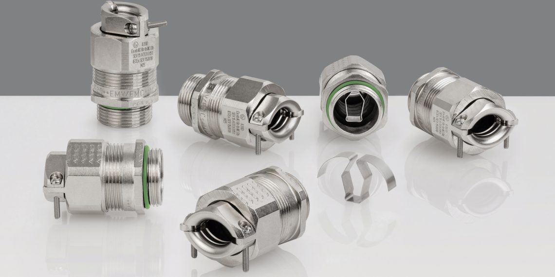 Ihre der Zündschutzart „erhöhte Sicherheit“ entsprechende Konstruktion verhindert zuverlässig die Entstehung von Zündgefahren aufgrund erhitzter Oberflächen, Funkenbildung oder Lichtbögen. Damit eignen sich die EMV-Kabelverschraubungen optimal als Anschlusslösung für frequenzgesteuerte Motoren, Abzweig- und Verbindungskästen, Messwarten, induktive Vorschaltgeräte sowie Leuchten in explosionsgefährdeten Bereichen einschließlich Zone1/21.