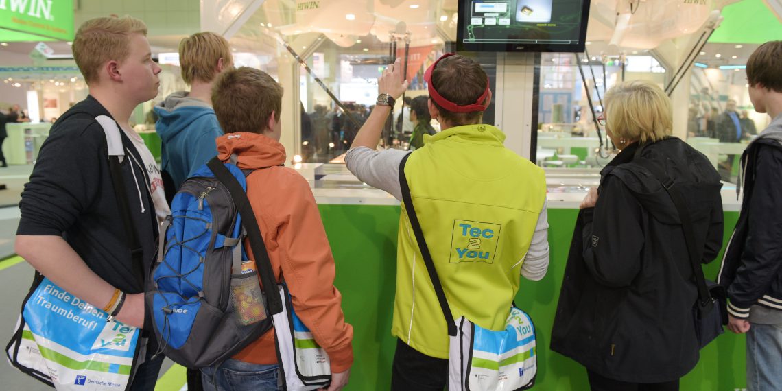 Genau dort setzt Tec2You an und spricht Jugend­li­che bereits im Schul­al­ter an. Das Tec2You Exkur­si­ons­pa­ket ermög­licht jedes Jahr mehr als 6 000 Jugend­li­chen von Abschluss­klas­sen einen ereig­nis­rei­chen Tag auf der Welt­leit­mes­se der Indus­trie. Eigens geschul­te Gui­des füh­ren Klas­sen­grup­pen nach bestimm­ten The­men auf­ge­teilt über das Mes­se­ge­län­de an die Stän­de aus­ge­wähl­ter Aus­stel­ler. Dadurch holen sich die Schü­ler den Impuls für eine tech­ni­sche Kar­rie­re. Finan­ziert wird Tec2You über­wie­gend durch Aus­stel­ler, die mit der Buchung eines Exkur­si­ons­pa­ke­tes eine Paten­schaft für eine Schu­le über­neh­men. Der Tec2You Pavil­lon im Anbau an der Hal­le 11 dient als Treff­punkt wäh­rend der HANNOVER MESSE.