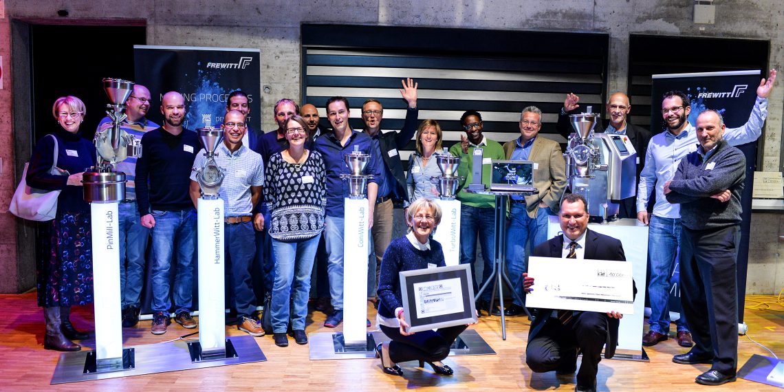Edgar Jeitziner, Präsident der Generaldirektion der Freiburger Kantonalbank, konnte den ersten Preis an Antoine Virdis, CEO der Maschinenfabrik Frewitt, übergeben. Frewitt hat das Zerkleinerungs-System «Fre-Drive-Lab» entwickelt, welches in Forschungslabors der Pharma‑, Feinchemie- und Nahrungsmittelindustrie eingesetzt werden kann. Eine Plattform, die sechs verschiedene Zerkleinerungs-Technologien beinhaltet: Jeder Mahlkopfeinsatz kann in wenigen Sekunden ausgewechselt werden. Damit ermöglich die FreDrive-Lab eine Reduzierung der Partikelgrösse von 20 Millimetern bis zu 50 Nanometern mit Kapazitäten von wenigen Gramm bis hin zu 50 Kilos pro Stunde für Pilotproduktionen. Mit ihren 80 Mitarbeitern exportiert das Unternehmen ihre Errungenschaften in über 80 Länder.
