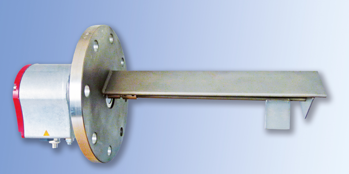 Eine entscheidende Funktion für die Winkelausleger-Erweiterung ist der Drehrichtungswechsel der MBA800-Geräte. Statt um 360° zu rotieren, wechselt die Welle der Geräte die Drehrichtung, sobald der Flügel gegen ein Hindernis trifft. Durch diesen Schwenkmodus, der eine erhöhte Messsicherheit bewirkt, konnte die Drehflügelgeneration MBA800 um den Winkelausleger ergänzt werden. Diese neue Gerätekombination bietet vor allem den Vorteil, dass dem Festsetzen von Schüttgut am Flügel entgegengewirkt wird – speziell für staubige Schüttgüter wie Mehl, die leicht verkleben, eine wichtige Neuerung. Das V‑förmige Dach des MBA-Winkelauslegers schützt Welle und Flügel vor herabfallendem Schüttgut. Er kann dadurch sogar direkt im Schüttstrom eingesetzt werden. Durch die stabile Form verzieht sich das Material nicht und hält auch schweren Schüttgütern stand. Das Gerät ist darüber hinaus auch für den waagrechten, seitlichen Einbau in Silos bestens geeignet, denn der Drehflügel im Winkelausleger ist um 90° nach unten gerichtet.