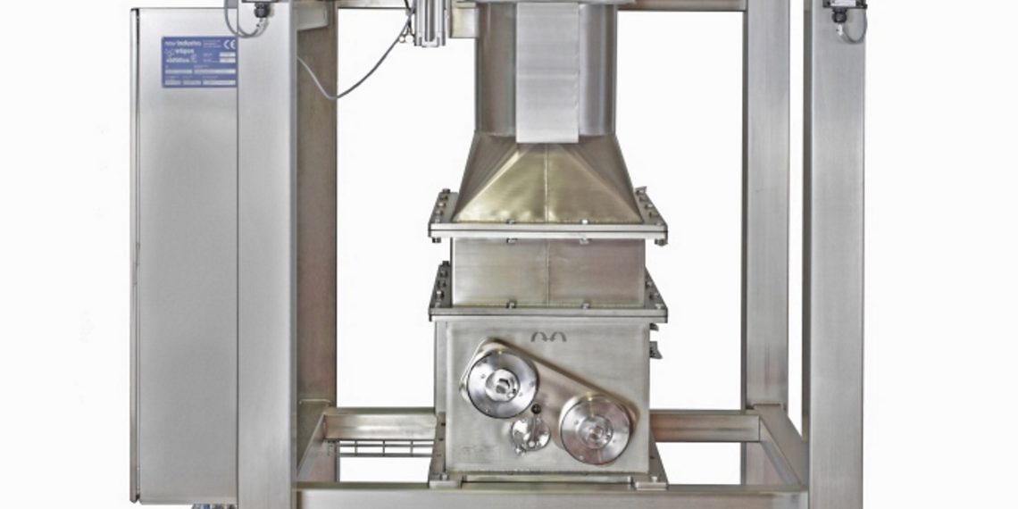 Zur staub­frei­en Ent­lee­rung wird der Big-Bag In-Liner des Unter­neh­mens Nov­in­dus­tra manu­ell in das pneu­ma­tisch betä­tig­te Big-Bag Andock­sys­tem ein­ge­legt, auto­ma­tisch ein­ge­fah­ren und mit der innen­lie­gen­den Bläh­dich­tung dicht an das Fall­rohr ange­dockt. Der inte­grier­te Grob­staub­fil­ter kann impuls­ge­steu­ert abge­r­ei­nigt und das gefil­ter­te Pro­dukt in den Pro­zess zurück­ge­bla­sen wer­den. Die mit den Dop­pel-Hub-Pushern aus­ge­tra­ge­nen Pro­dukt­klum­pen wer­den vom inte­grier­ten Klum­pen­bre­cher zer­klei­nert und über die nach­ge­schal­te­te Zel­len­rad­schleu­se dem Fol­ge­pro­zess kon­trol­liert zuge­teilt. Mit dem inte­grier­ten Touch-Screen kön­nen sämt­li­che Funk­tio­nen pro­dukt- und pro­zess­spe­zi­fisch gesteu­ert und kon­trol­liert wer­den. Über die ein­ge­bau­ten WIP-Düsen kann die Anla­ge bei jedem Pro­dukt­wech­sel auto­ma­tisch vor­ge­r­ei­nigt und wenn nötig manu­ell end­ge­rei­nigt werden.