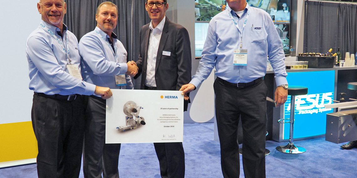 Martin Kühl, Leiter des Geschäftsbereichs Etikettiermaschinen bei HERMA, bedankte sich anlässlich der PackExpo 2016 in Chicago für die überaus erfolgreiche 20-jährige Zusammenarbeit mit dem Team von Aesus. Er sagte: „Aesus hat einen maßgeblichen Anteil daran, dass HERMA Etikettierer in Kanada und auch in den USA heute sehr große Wertschätzung erfahren und immer stärker nachgefragt werden. Wir können stolz darauf sein, trotz des intensiven Wettbewerbs eine so beachtliche Marktposition erreicht zu haben.“ Das betreffe sowohl die Etikettierer vom Typ HERMA 400, der auf die Anforderungen des nordamerikanischen Markts angepasst wurde, als auch komplette Etikettieranlagen. „Bis heute haben wir mehr als 2.500 HERMA Etikettierer und entsprechendes Zubehör verkauft. Wir sind auf unserem Markt der größte OEM-Partner von HERMA“, berichtete Daniel Lachapelle stolz.