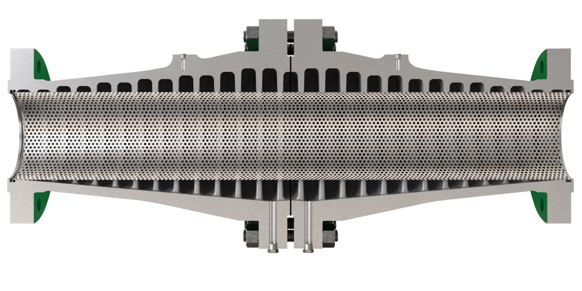 Im Gegensatz zu anderen Lösungen zur Geräuschdämpfung stellt der Dämpfungseinsatz kein Hindernis in der Rohrleitung dar. Daher kann dieser Einsatz in Anwendungen verwendet werden, in denen Schwebstoffe im Prozessfluss mitgeführt werden und/oder in denen Molche zu Reinigungs- und Wartungszwecken erforderlich sind.