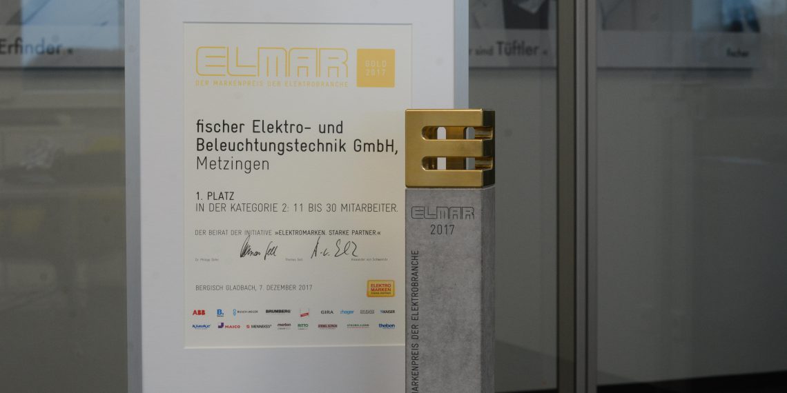 Der familiengeführte Spezialist Fischer Elektro- und Beleuchtungstechnik freut sich über die Auszeichnung mit dem Markenpreis ELMAR 2017, der jährlich von der Initiative „Elektromarken. Starke Partner.“ für herausragendes Markenbewusstsein vergeben wird. Das Unternehmen konnte sich gegen eine Vielzahl von Mitbewerbern aus ganz Deutschland durchsetzen und belegte in Kategorie 2 (11 — 30 Mitarbeiter) den ersten Platz.
