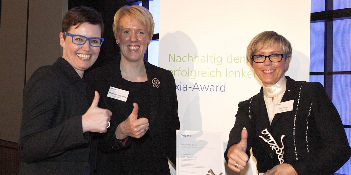 Die HARTING Tech­no­lo­gie­grup­pe erfüll­te alle drei Wett­be­werbs­ka­te­go­rien. Um schon früh natur­wis­sen­schaft­lich-tech­ni­sche Fach­kräf­te zu för­dern, koope­riert HARTING eng mit Schu­len und Hoch­schu­len. Die hohe Eigen­ka­pi­tal­quo­te ermög­licht nahe­zu eine Kre­dit­ge­ber­un­ab­hän­gig­keit. HARTING ist bekannt für hohe Qua­li­tät, Zuver­läs­sig­keit und Inno­va­ti­on.  „Die Ver­lei­hung des Axia-Awards zeigt, dass wir auf dem rich­ti­gen Weg sind. Wir wol­len lie­ber soli­de wach­sen als mög­lichst schnell“, sagt Mare­sa Har­ting-Hertz, Vor­stand Finan­zen und Ein­kauf sowie per­sön­lich haf­ten­de Gesell­schaf­te­rin.  „Wir den­ken über die Anfor­de­run­gen der Märk­te in fünf bis zehn Jah­ren nach – und rich­ten unse­re Stra­te­gie danach aus. Auch die­se mit­tel- und lang­fris­ti­ge Pla­nung hat die Jury bei der Preis­ver­ga­be berück­sich­tigt“, sagt Git­ta Pecher, Zen­tral­be­reichs­lei­te­rin Cor­po­ra­te Development.