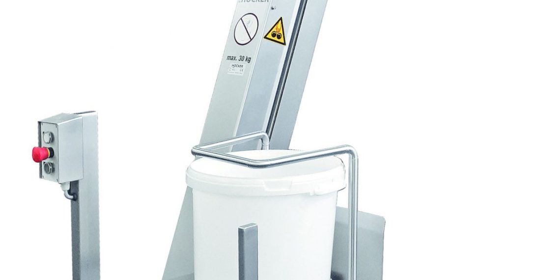 Ein Bei­spiel einer Hebe-Kipp­vor­rich­tung für einen spe­zi­el­len Anwen­dungs­fall ist ein Her­stel­ler von vega­nen Würzmitteln und Auf­stri­chen. Auf der Suche nach einer Lösung für sei­ne Her­aus­for­de­rung war die­ser auf Höcker zuge­kom­men, nach­dem er auf der Inter­net­sei­te bereits die Hebe-Kipp­vor­rich­tung L25 als möglicherweise geeig­net ent­deckt hat­te. Die Beson­der­heit an sei­ner Anfra­ge: im Pro­duk­ti­ons­pro­zess wer­den kei­ne Beschi­ckungs­wa­gen genutzt, son­dern 30-l-Eimer. Der Arbeits­schritt der Mit­ar­bei­ter bestand dar­in, die mit Gewürzen und Meh­len gefüllten Eimer über eine Tritt­lei­ter in eine 1,60 Meter hohe Maschi­ne zu schütten, in der die Zuta­ten gemischt wer­den. Bei einem Gewicht von bis zu 25 Kilo­gramm je Eimer auf Dau­er eine sehr anstren­gen­de Arbeit.