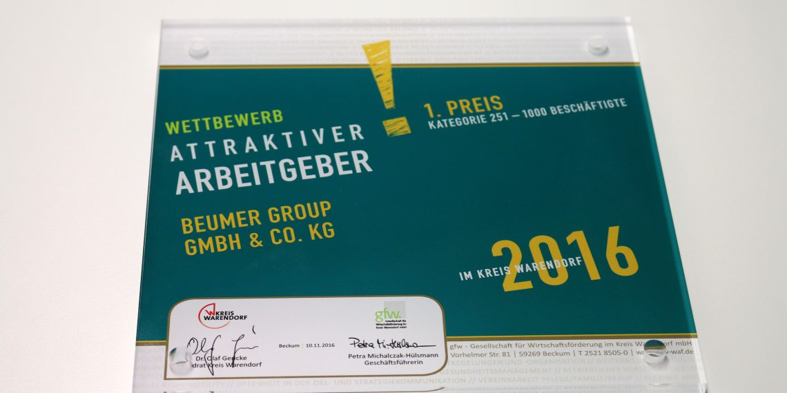 Die BEUMER Group ist Sieger des Wettbewerbs um den Titel „Attraktiver Arbeitgeber im Kreis Warendorf 2016“. Ausgeschrieben wurde dieser von der Gesellschaft für Wirtschaftsförderung in Warendorf im Münsterland. Eine unabhängige und fachkundige Jury bewertete die über 40 Teilnehmer nach Kriterien wie flexible Arbeitszeiten, Betriebsklima, Bezahlung oder Karrierechancen im Unternehmen. In der Kategorie Betriebsgröße von 251 bis 1.000 Mitarbeiter setzte sich die BEUMER Group gegen ihre Konkurrenten durch und belegte den ersten Platz. Wolfgang Hoss, CFO der BEUMER Maschinenfabrik und Personalchef Burkhard Pieper nahmen die Auszeichnung bei der Preisverleihung in Oelde entgegen.