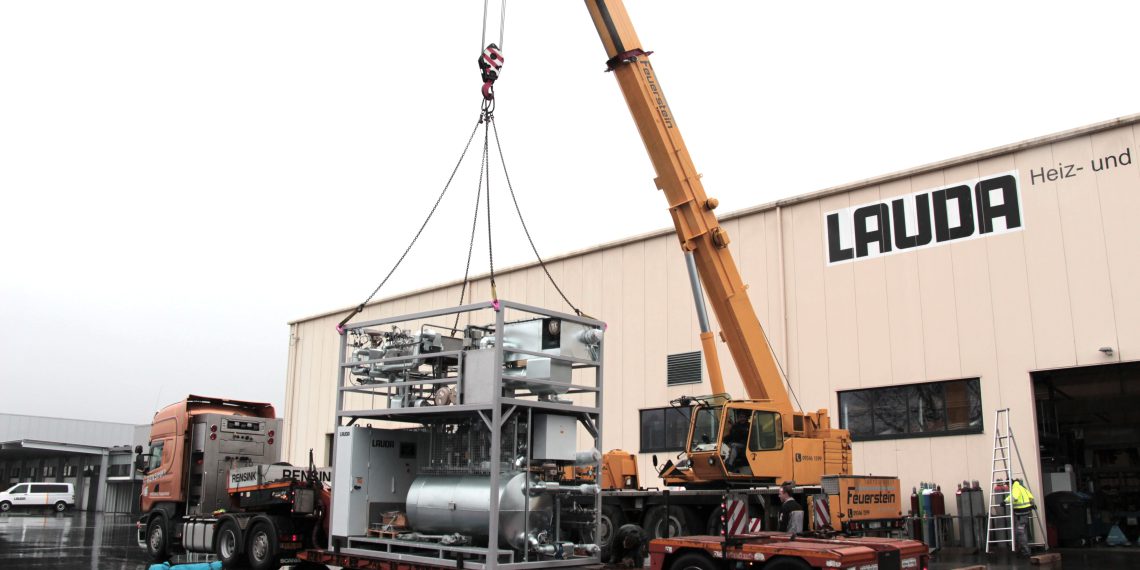 Nach den erfolgreichen Testläufen und der Kundenabnahme im Hause LAUDA wurde die erste Hochtemperaturanlage für den Transport zum Kunden verladen, bei der eine Salzschmelze als Wärmeträger verwendet wird. Seit mehr als 50 Jahren projektiert LAUDA Heiz- und Kühlsysteme Sonderanlagen für die chemische und pharmazeutische Industrie. Sie dienen zur exakten Temperierung von Reaktionsbehältern, Verdampfern, Trocknern oder Filtern mittels Wärmeträgerflüssigkeiten – häufig Thermalöl. Werden sehr hohe Temperaturen benötigt, zum Beispiel bei der Aluminiumoxid- oder Melamin-Produktion, Laugeneindampfung und verschiedenen Hochtemperaturreaktionen, bieten Salzschmelzen als Wärmeträger echte Vorteile im Vergleich zu Thermalölen, welche auf eine Betriebstemperatur von etwa 400 °C begrenzt sind. Die von LAUDA verwendeten Salzgemische ermöglichen dagegen Temperaturen bis 550 °C. Sie sind unter Betriebsbedingungen flüssig, besitzen ideale Nutzungseigenschaften wie geringe Viskosität und hohe Wärmekapazität und gewährleisten einen drucklosen Betrieb.