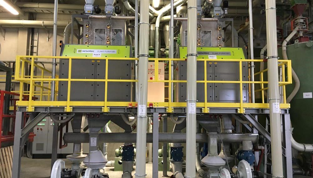 Die vorsortierten PET-Abfälle erhält MultiPet in Ballen gepresst. Nach Auflösung der Ballen werden die vorsortierten Kunststoffe zunächst auf Störstoffe untersucht, anschließend gemahlen und intensiv gewaschen. Im Anschluss an ein zweistufiges Dichte-Trenn-Verfahren mit 2‑fach Heißwäscher übernehmen die Multi-Sensorsortiersysteme FLAKE PURIFIER+ von Sesotec. Sie separieren Fehlfarben, Fremdkunststoffe und Metalle aus den Kunststoff- Flakes. Die FLAKE PURIFIER+ Geräte sind für den Einsatz in der Kunststoff-Flake-Aufbereitung konzipiert und zeichnen sich vor allem durch eine einfache Bedienung sowie durch erhöhte Durchsatzleistungen aus.