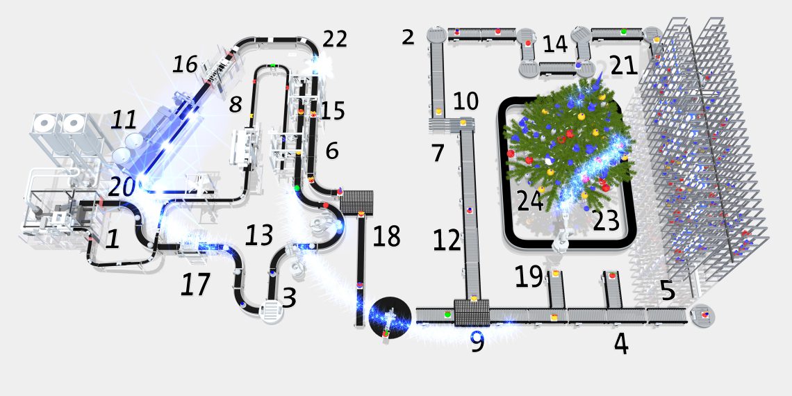 Ab 1. Dezember können sich Technikliebhaber wieder über eine ausgefeilte Animation beim Lenze-Online-Adventskalender freuen. Der Spezialist für Motion Centric Automation zeigt, wie in einer weihnachtlich geschmückten Industrie 4.0 Fabrik mit Lenze-Automatisierungstechnik Weihnachtskugeln in verschiedenen Farben und Formen hergestellt werden – und das in Losgröße 1.