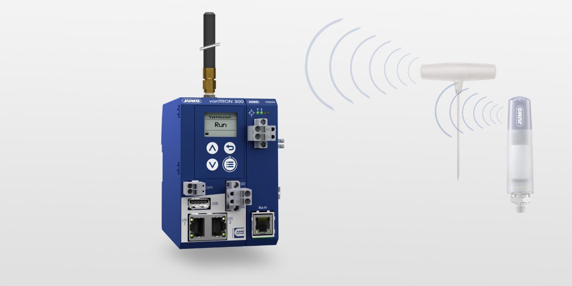Über ein Funk-Gateway können bis zu 32 drahtlose JUMO Wtrans-Sensoren, beispielsweise zur Messung von Temperatur oder Druck, angeschlossen werden. Darüber hinaus verfügt die Zentraleinheit als Verbindungsmöglichkeiten über 1 USB-Host, 2 Ethernet-Schnittstellen und 1 RS485-Anschluss.