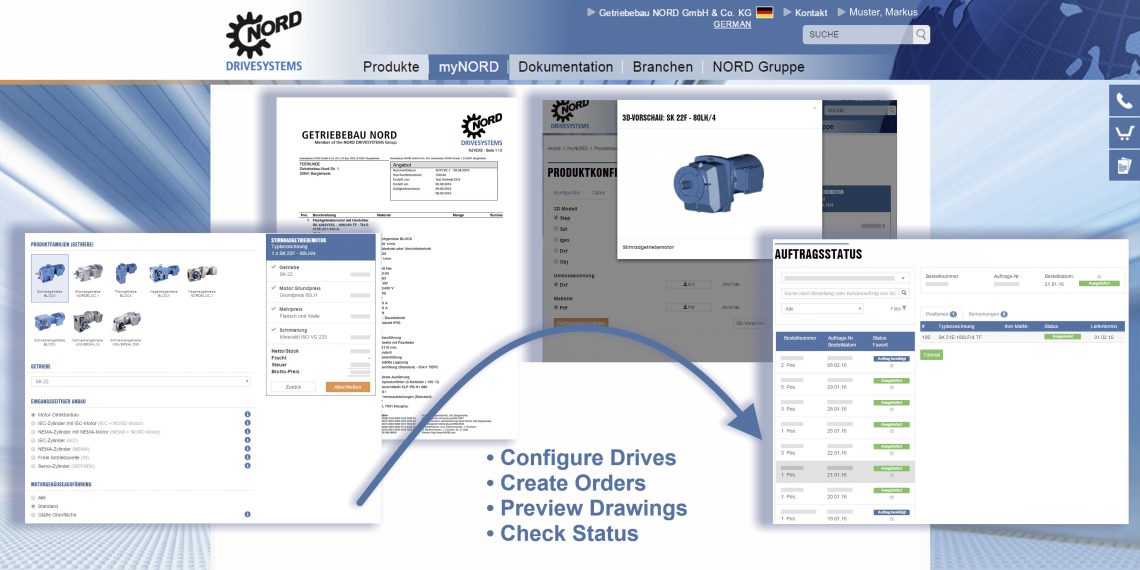 Das ab sofort zugängliche myNORD-Kundenportal auf der Website von NORD DRIVESYSTEMS (https://my.nord.com/) unterstützt Maschinenkonstrukteure und Einkäufer mit einer Reihe jederzeit verfügbarer komfortabler Funktionen. myNORD macht es für jeden Kunden und Interessenten möglich, anwendungsgerechte Antriebslösungen besonders einfach und schnell zu planen und zu beschaffen. Das erste im Portal bereitgestellte Werkzeug ist der Online-Konfigurator. Mit diesem lassen sich zügig Lösungen für Antriebstechnik aus dem gesamten NORD-Standard-Produktportfolio zusammenstellen, das zahlreiche Getriebe- und Motorentypen mit individuell abgestimmter Antriebselektronik umfasst.