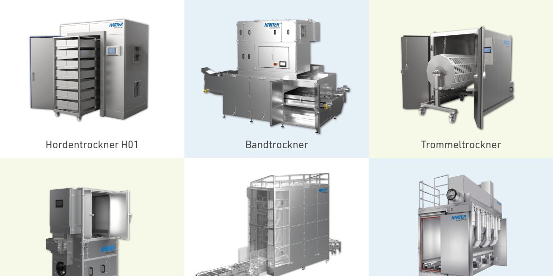 Die Harter-Trockner arbeiten im lufttechnisch geschlossenen System. Garantiert gleichbleibende Parameter machen den Prozess unabhängig von sämtlichen klimatischen Rahmenbedingungen. Falls gewünscht oder prozessbedingt erforderlich, kann die Trocknung durch geringfügige Anpassungen auch zur Kühlung verwendet werden und damit als kombinierte Trocken-Kühl-Anlage realisiert werden. Eine druckluftfreie Abblastechnik gehört ebenso zum Leistungsangebot des Trocknungsanlagenbauers. Harter-Trockner eigenen sich sowohl für Chargenbetrieb als auch für kontinuierliche Prozesse. Auch die Trocknung von Reinräumen gehört schon länger zum Portfolio des Allgäuer Unternehmens. Zudem hat sich Harter im Bereich der Trocknung von Medizinalcannabis weltweit ein neues Standbein aufgebaut. Hygiene- und GMP-Vorgaben werden bei der Konzeption der Anlagen stets berücksichtigt und umgesetzt. Die hocheffizienten, strombetriebenen Kondensationstrockner mit Wärmepumpe wurden 2017 als zukunftsfähige Technologie eingestuft und werden in der D‑A-CH Region mit bis zu 40 Prozent staatlich gefördert. Nachweislich werden Energieeinsparungen von bis zu 85 Prozenterzielt.