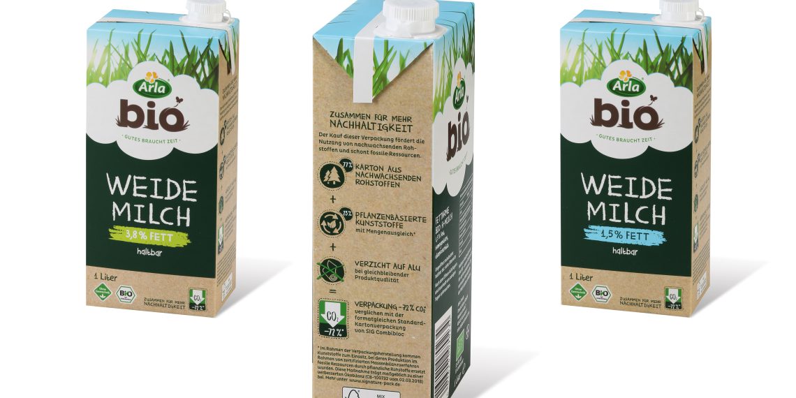 Arla Foods Deutschland setzt als erstes Unternehmen auf das innovative Signature Pack von SIG – die weltweit erste aseptische Kartonpackung mit 100%igem Bezug zu pflanzenbasierten nachwachsenden Rohstoffen. Arla bietet jetzt seine 1‑Liter 1,5% und 3,8% Bio-Milch (Arla Bio Weidemilch) im Signature Pack an.