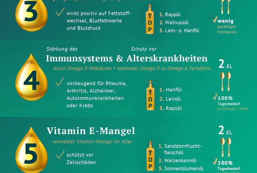 Doch dieser schlechte Ruf wurde viel zu pauschal formuliert, denn ausschlaggebend ist die Qualität: Während vor gesättigten Fettsäuren zu Recht gewarnt wird, haben ungesättigte Fettsäuren einen ausgesprochen positiven Einfluss auf den Blutdruck und den Fettstoffwechsel. Und hier haben das Olivenöl sowie Raps‑, Schwarzkümmel- und Leinöl die Nase vorn. Ein Blick in den mediterranen Raum zeigt ganz praktisch, wie gut verträglich die Mittelmeerkost ist – und wie sie sich als Gesundbrunnen erweisen kann. Es gilt also: Nicht zu viel an gesättigten, dafür umso mehr an ungesättigten Omega-3-Fettsäuren – davon profitiert nicht nur die Immunbalance, sondern auch die Gehirnfunktion und der Blutfluss. Um dem altersbedingt steigenden Risiko für entzündliche Erkrankungen, Bluthochdruck und Arteriosklerose entgegenzuwirken, sollten Senioren also gesunde Pflanzenöle konsumieren, wie zum Beispiel Oliven‑, Lein‑, Hanf‑, Kürbiskern‑, Traubenkern- oder Rapsöl.