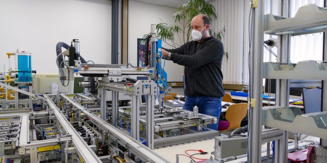 Prof. Dr. Falk Salewski und Hendrik Kösters nahmen nach einer fast vierjährigen Vorbereitungsphase die neue Modellfabrik in Betrieb. Das bisherige Herzstück des Labors wurde im vergangenen Semester nach mehr als 20 Jahren Einsatz in Lehre und Forschung abgebaut und nun durch eine moderne Anlage ersetzt. An sechs industrieüblichen und autonom funktionierenden Einzelstationen im Labormaßstab können Studierende des Fachbereichs Elektrotechnik und Informatik realitätsnah lernen, wie Automatisierungstechnik funktioniert.