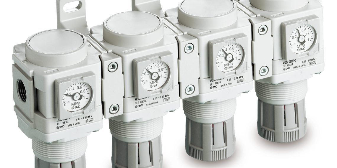 Gerade pneumatische Anwendungen, die die Regulierung verschiedener Drücke erfordern, können für Prozessingenieure eine Herausforderung sein. Schließlich gilt es auch hier, nicht nur die Regelung zuverlässig zu gewährleisten, sondern ebenso Platz einzusparen und den Installations- und Wartungsaufwand gering zu halten. Mit der Serie AR#M bietet SMC einen modularen Druckregler, der über dieses Anforderungsprofil hinaus zahlreiche weitere Ansprüche erfüllt. So ermöglicht die neue Lösung des Spezialisten für pneumatische und elektrische Automatisierung den modularen Aufbau als Reglerbatterie im One-Box-Design als einheitliche Gehäusekonstruktion, dabei die zusätzliche Verblockung mit allen Anbauteilen (Filter, Regler, Öler) der Wartungseinheit der Serie AC‑D sowie eine zentralisierte Druckregelung auf der Rückseite.