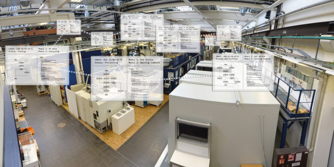Titelbild: Ziel im Leistungszentrum “Vernetzte, adaptive Produktion” ist die komplett digitalisierte und vernetzte Produktionsumgebung. (Quelle: Fraunhofer IPT)