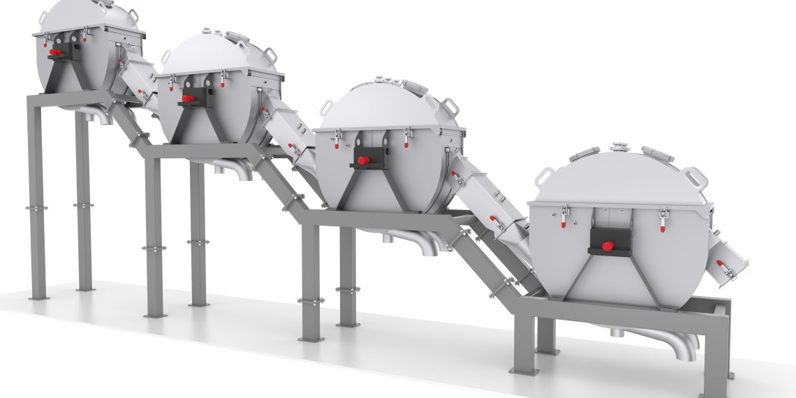 Die Filtereinheiten sind auf einem Rahmengestell aufgebaut. Daraus resultiert ein kompaktes Anlagendesign. Die Kombination aus geringem Behältervolumen und einer kurzen Verweilzeit der Maische vermindert die Sauerstoffaufnahme der abgeläuterten Würzen erheblich. Die Restmaischepartikel, die die Siebdurchgangsfläche nicht passieren können, werden durch die Drehbewegung und die Schwerkraft zur nächsten Filtereinheit gefördert. Das Anschwänzen der Treber erfolgt im Übergang zwischen den Filtereinheiten. An einem integrierten Stauelement entstehen Turbulenzen, die eine homogene Vermischung der Restmaische mit dem Anschwänzwasser bewirken.