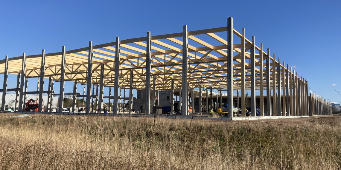 Wer derzeit die Baustelle sieht, kommt eventuell ins Grübeln, ob dort wirklich Industriebauten entstehen. Das Tragwerk im Rohbau sieht eher aus wie ein Fachwerkhaus. Der Schein trügt nicht, denn der Bau wird nicht nur in Stahl und Stahlbeton ausgeführt, sondern auch mit 1.230 Kubikmeter Holz, was einem Gewicht von 615 Tonnen entspricht. Dabei wurde und wird das Material international schon lange angewendet und erlebt auch in Europa eine Renaissance.