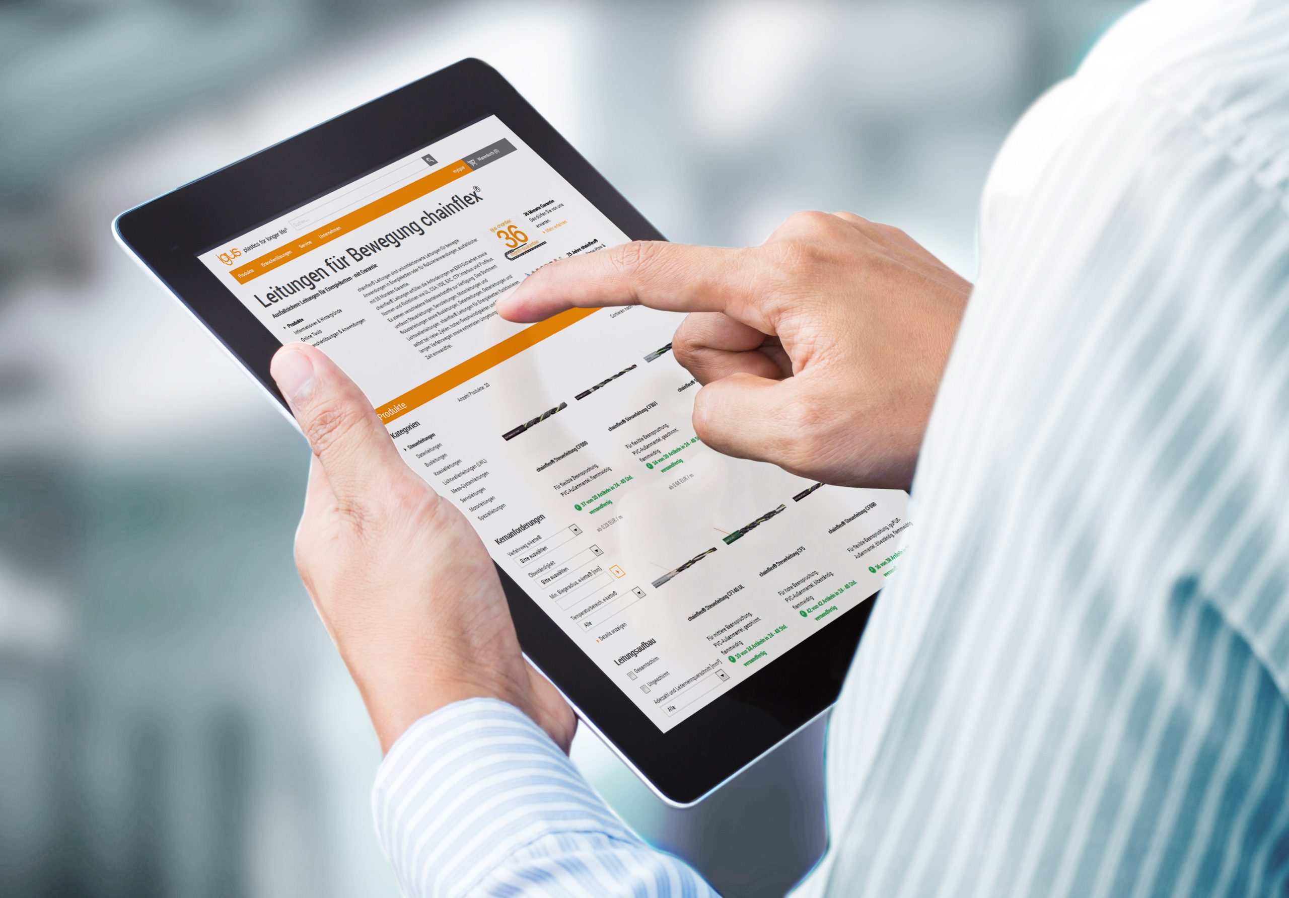 Die Suche nach dem passenden Produkt nimmt aufgrund einer hohen Angebotsvielfalt und einer großen Menge an Daten häufig viel Zeit in Anspruch. Um Informationen schnell und einfach verfügbar zu machen, hat igus seine chainflex Website für e‑ketten Leitungen durch den Einsatz von neuen Filtern und einer intuitiven Seitennavigation weiter verbessert. Der Kunde kann dort nicht nur die richtige Leitung für seine Anwendung schnell finden und diese im Online-Shop bestellen, sondern hat auch die einzigartige Möglichkeit die Lebensdauer der ausgewählten Leitungen direkt online zu berechnen.