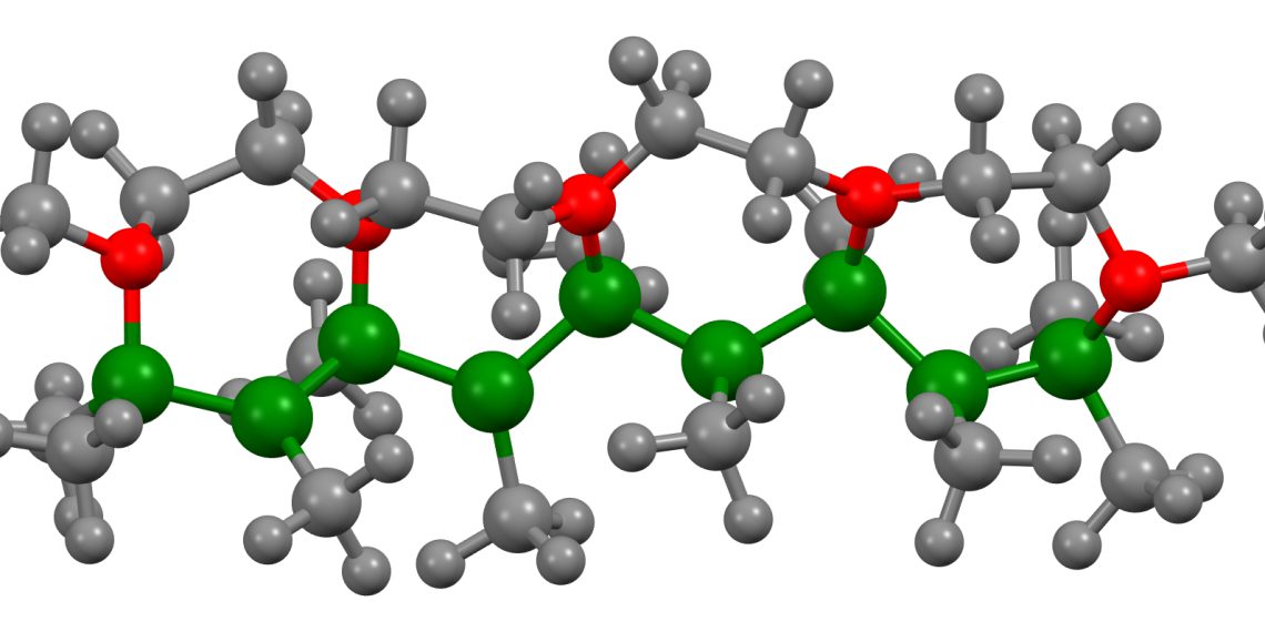 Titelbild: So könnte ein Polymer auf der Basis von Bor aussehen: Die Bor-Atome sind grün; die roten Kugeln entsprechen Sauerstoff-Atomen, die grauen Kohlenstoff- und Wasserstoff-Atomen (Quelle: Dr. Rian Dewhurst)