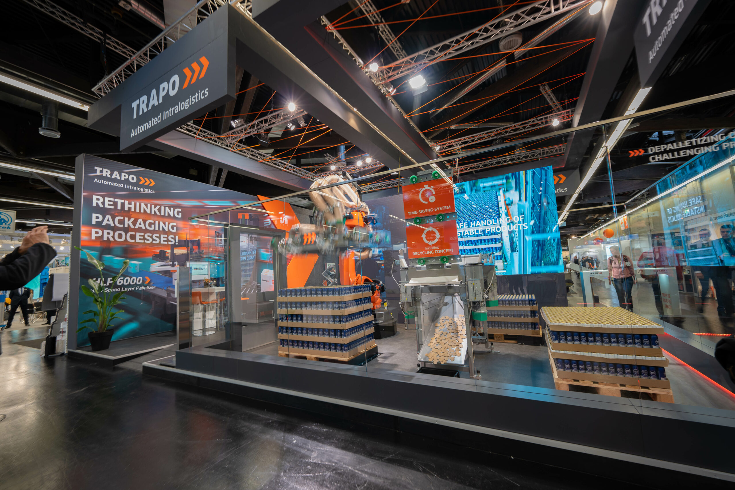 Neben konventionellen Lösungen mit Portal- und Knickarmroboter informierten die Vertriebsmitarbeiter in der TRAPO Lounge bei Kaltgetränken, Kaffee und Snacks anhand von Anwendungsbeispielen zum Hochleistungs-Lagenpalettierer HLP 6000, der sich maßgeschneidert in seine Umgebung einfügen lässt. Um dem Fachpublikum weitreichende Antworten zu geben, erläuterten sie an den Monitoren der „TRAPO Hubs“ im persönlichen Gespräch herausragende Features – anhand von Filmsequenzen aus der Praxis und mithilfe von Animationen.
