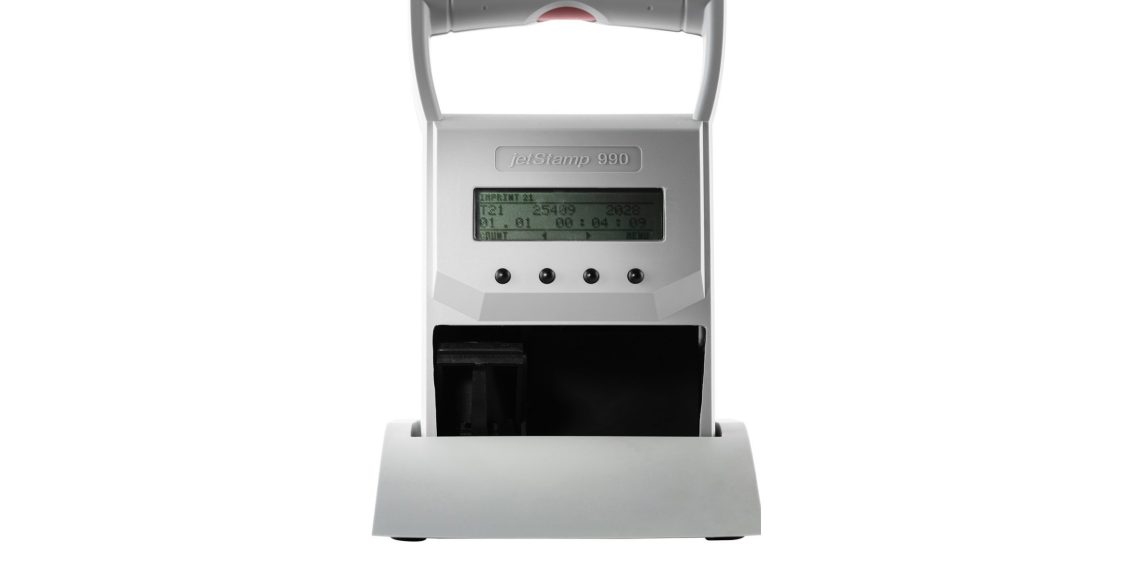 Der jetStamp® 990 druckt Datum, Uhrzeit, Texte, Nummern, ein- und zweizeilige Abdrucke. Besonders beliebt ist das Gerät für den Druck von Mindesthaltbarkeitsdaten, Batch- Nummern oder dem Produktionsdatum. Auch in der Postbearbeitung sorgt der handliche Drucker für eine schnelle Bearbeitung.