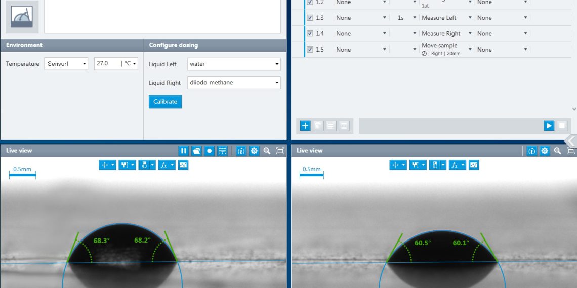 Für Schnelligkeit sorgt auch das für Messungen mit der Doppeldosierung entwickelte Auswerteverfahren: Zur gleichzeitigen Darstellung beider Tropfen im Video ist das Bildfeld der hochauslösenden Kamera gesplittet, sodass die Tropfenkonturen in zwei parallelen Videobildern analysiert werden. Aus den resultierenden Kontaktwinkeln berechnet die Software die SFE des Festkörpers. Der gesamte Vorgang vom Start der Dosierung bis zur Berechnung der SFE vollzieht sich vollautomatisch innerhalb einer Sekunde. Für diese innovative „One-Click SFE“-Methode und die neuartige Dosiertechnologie hat KRÜSS zwei Patente angemeldet.