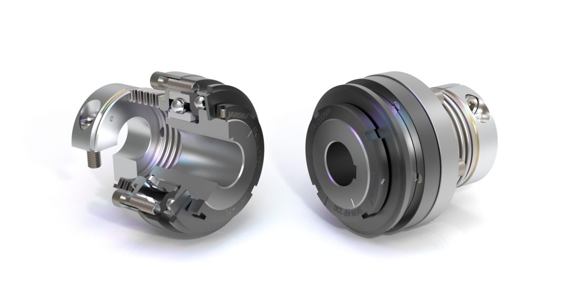 Die flexible, spielfreie Sicherheitskupplung der Baureihe SKW-KP ist eine Kombination aus Sicherheitskupplung und Servo-Metallbalgkupplungsanbau für direkte Antriebe. Der Sicherheitskupplungsteil kommt mit kostengünstiger Passfedernut-Verbindung und integriertem Rillenkugellager für hohe Lagerkräfte, der Metallbalgkupplungsanbau mit 4‑welligem Balg und montagefreundlicher Easy-Klemmnabe. Die Kombination gewährleistet sowohl den Überlast- und Kollisionsschutz als auch den Ausgleich von Fehlausrichtungen. Erhältlich ist sie für Drehmomentbereiche von 2 – 9000 und Wellendurchmesser von 6 – 140 Millimeter im Metallbalgkupplungsanbau und 6 – 110 Millimeter im Sicherheitskupplungsteil.