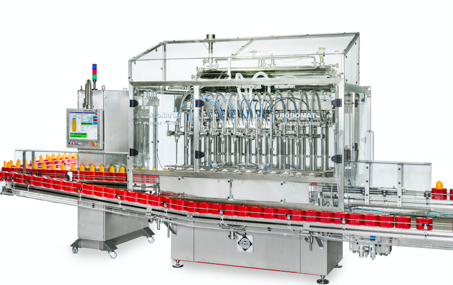 Bei der neuesten Abfüllanlage, die im Zuge einer Produktionserweiterung installiert wurde, handelt es sich um eine Serienmaschine ROBOMAT autoCIP 2/12–1000 mit speziell nach Kundenwunsch angepassten Ausstattungsmerkmalen. Sie wurde mit einem Ex-Schutz versehen, damit alkoholhaltige, brennbare Flüssigkeiten wie Lösemittel sicher verarbeitet werden. Außerdem können Produkt-Komponenten in zwei Phasen mit gleichen oder unterschiedlichen Volumen abgefüllt werden. Den sicheren Stand der Behälter auf dem Transportband gewährleistet das Ratilight Puck System. Das Verschließen erfolgt automatisch über zwei Verschließmaschinen Robocap und Robocap DP auf Drehmoment. So wird ein Auslaufen der Verpackung verhindert und ermöglicht es gleichzeitig, zwei verschiedene Verschlüsse hintereinander auf ein Behältnis aufzubringen.