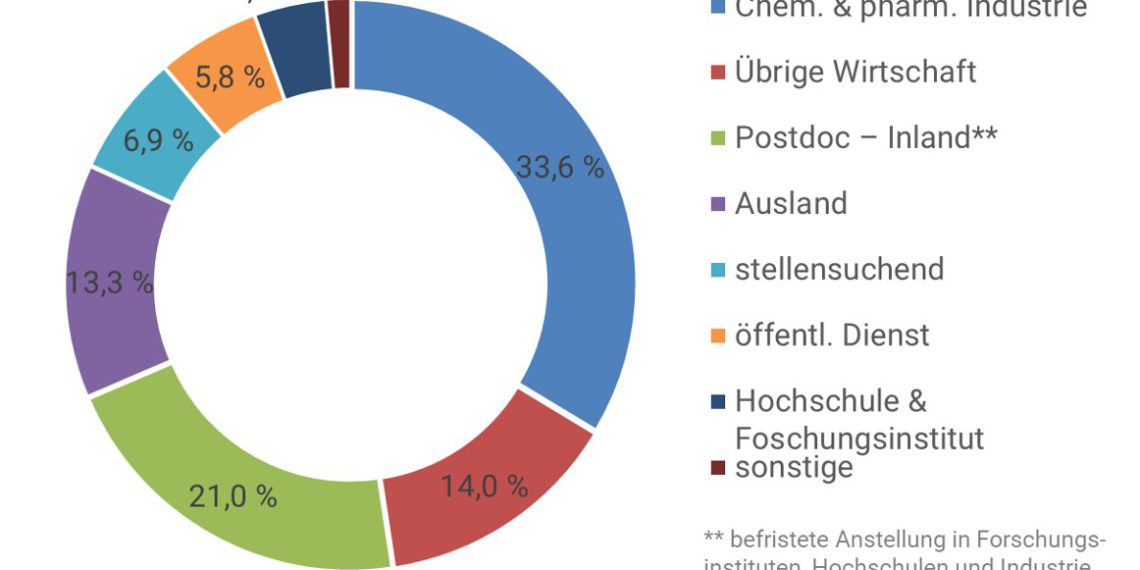 Von 44 Pro­zent der pro­mo­vier­ten Absol­ven­tin­nen und Absol­ven­ten in Che­mie ist der ers­te Schritt ins Berufs­le­ben bekannt. Nach Daten der Hoch­schu­len tra­ten etwa 34 Pro­zent eine Stel­le in der che­mi­schen und phar­ma­zeu­ti­schen Indus­trie (2020: 38 Pro­zent) an, 21 Pro­zent (2020: 20 Pro­zet) nah­men eine befris­te­te Stel­le im Inland an (inkl. Post­doc). 14 Pro­zent waren nach dem Abschluss in der übri­gen Wirt­schaft tätig (2020: 12 Pro­zebt) und 13 Pro­zent nah­men nach dem Abschluss eine Stel­le im Aus­land an (2020: 11 Pro­zent). Rund 6 Pro­zent der Absol­ven­tin­nen und Absol­ven­ten hat­ten eine Stel­le im öffent­li­chen Dienst inne (2020: 4 Pro­zent). Zum Zeitpunkt.