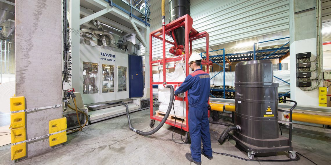 In einer ande­ren Che­mi­on-Hal­le im Che­mie­park Uer­din­gen kommt ein Ruwac-Sau­ger vom Typ DS 2520 L‑B1 mit Vor­ab­schei­der zum Ein­satz. Er ist an einer Abfüll­an­la­ge instal­liert, die 900 kg-Säcke füllt. Soll­te Gra­nu­lat neben das Gebin­de fal­len, wird es in einer Auf­fang­wan­ne unter­halb der Maschi­ne gesam­melt und aufgesaugt.