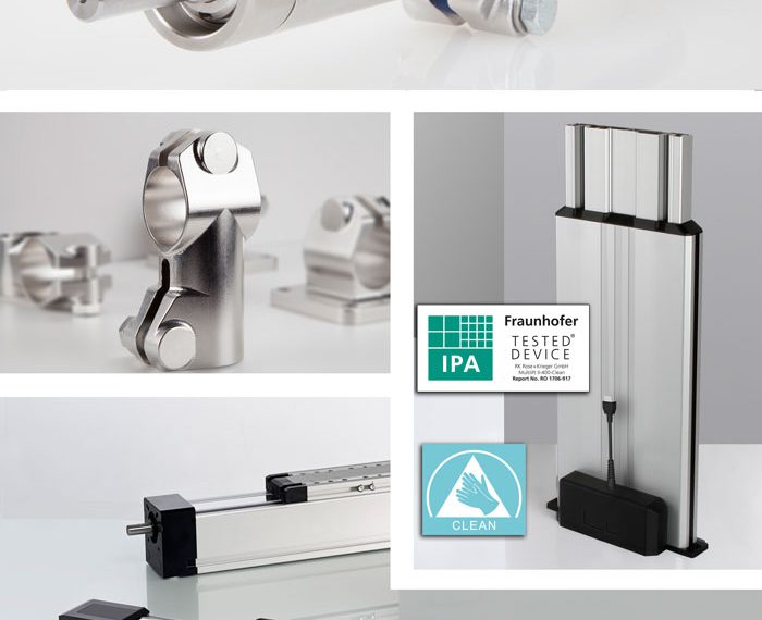 Für Reinräume der Klasse 1 – in denen sensible Bauteile wie beispielsweise Halbleiter gefertigt werden – hat RK Rose+Krieger die Profil-Lineareinheiten der Serie RK Duoline clean für Automatisierungsaufgaben im Programm. Für Reinräume der Klassen 5 bis 9 bietet das Unternehmen mit der Hubsäule Mulitilift II clean eine hygienische Lösung für ergonomische Arbeitsplatzsysteme. Alle Komponenten wurden nach EN ISO 14644–1 getestet und entsprechend zertifiziert.